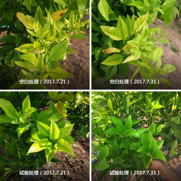 试验现象:试验处理为中度黄化叶片矫正试验,处理10天后回复较好。空白处理为中度黄化叶,浇水处理后黄化加剧。