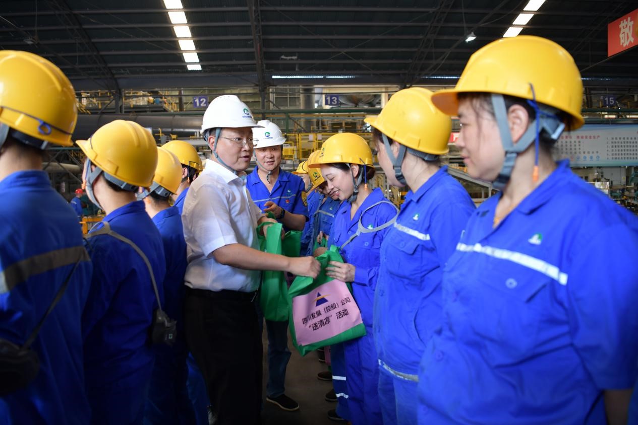 会后,徐一心一行实地调研了德阳基地复合肥高塔车间、工业磷铵车间、新材料公司以及德阿新材料项目,详细了解了复合肥及工业级磷酸一铵的生产工艺、磷石膏综合利用和新材料项目产品研发及生产建设情况,听取了企业在生产运营中遇到的难点堵点,并为车间职工送去防暑降温物品。徐一心嘱咐企业一定要管理求严,把安全生产要求落实到每个岗位。