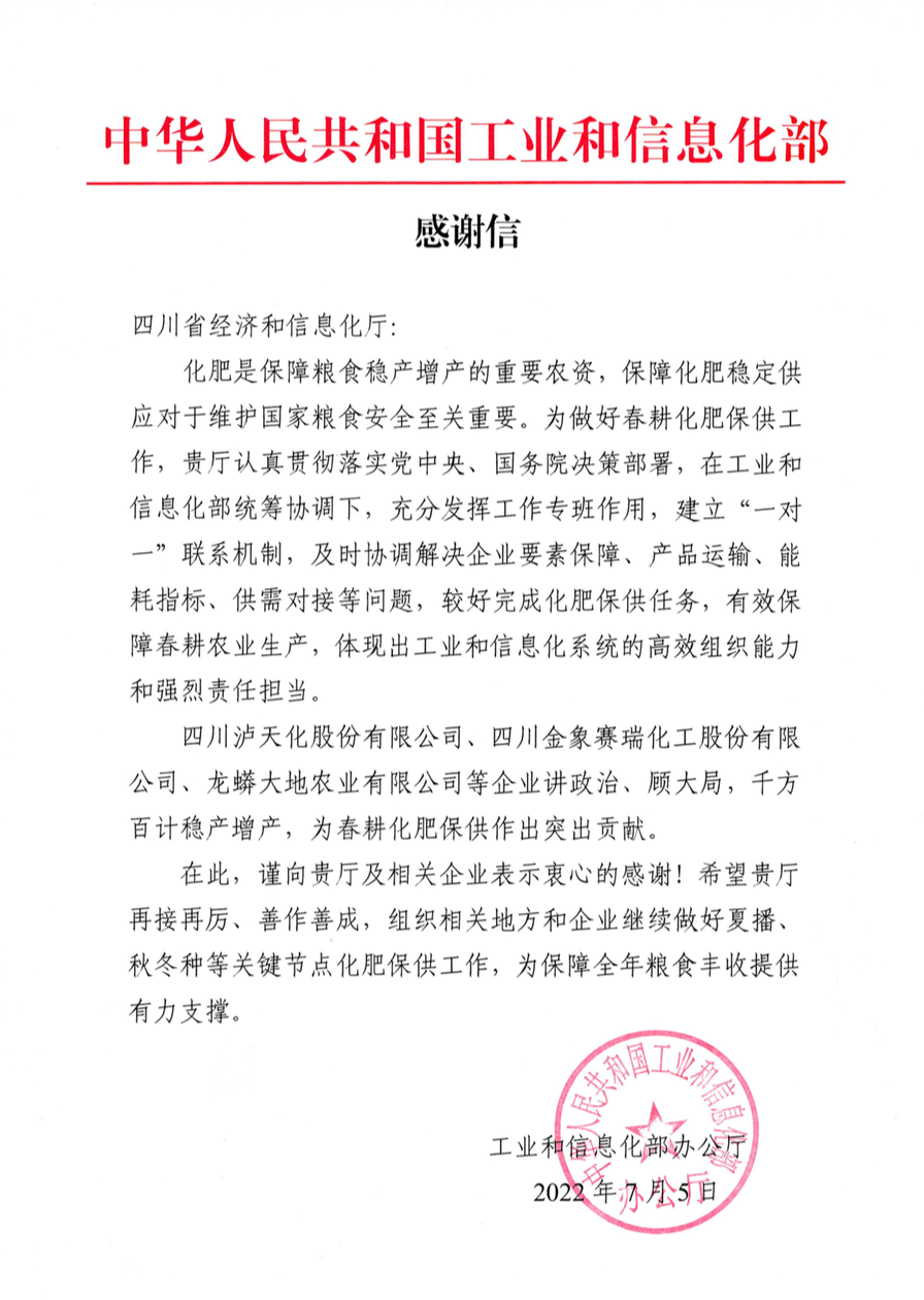 近日,川发龙蟒直接出资企业龙蟒大地农业有限公司收到德阳市工信局转送的国家工信部《感谢信》,对龙蟒大地等四川三家肥料企业“讲政治,顾大局,千方百计稳产增产,为春耕化肥保供作出突出贡献”表示衷心感谢。