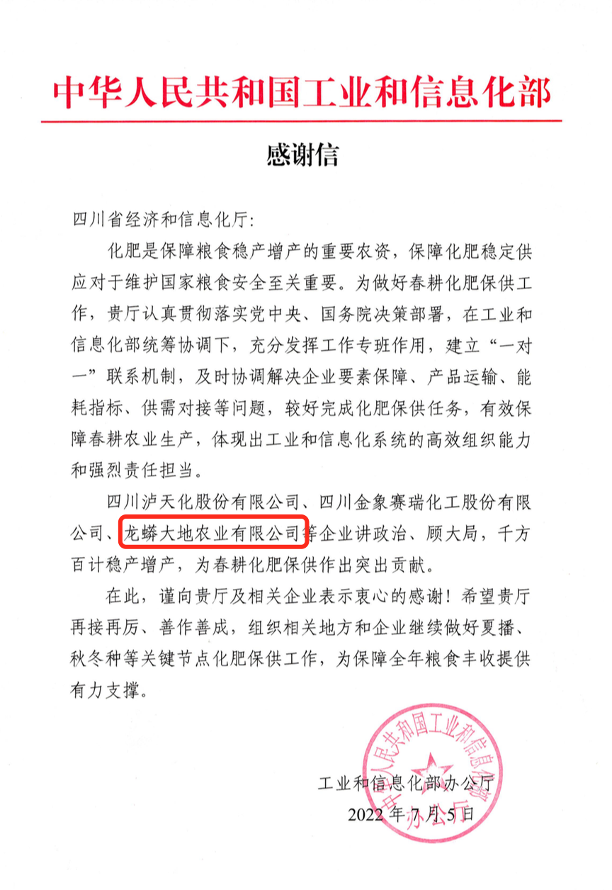 祝贺:龙蟒大地收到国家工信部《感谢信》