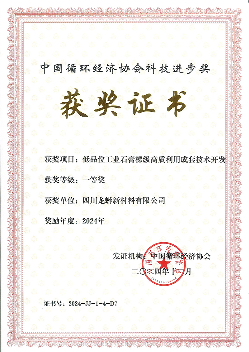 川发龙蟒“低品位工业石膏梯级高质利用成套技术”荣获中国循环经济协会科技进步奖一等奖