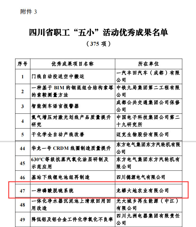 近期,四川省总工会对“五小”活动中涌现出的先进集体和优秀成果进行表彰。大地公司荣获四川省职工“五小”活动先进单位称号,公司所属“一种磷酸脱硫系统”项目被评为四川省职工“五小”活动优秀成果。